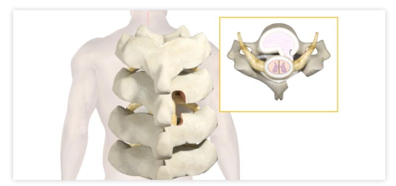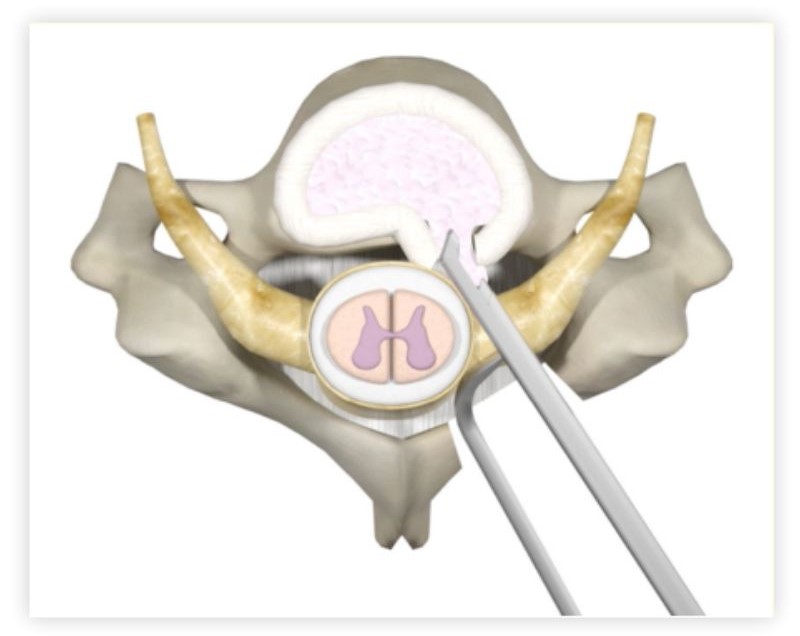 An incision is made on the back of the neck. Surgical instruments are used to remove a portion of the lamina. If there is a disc herniation, the laminotomy portal allows access for removing pieces of the disc that are compressing the spinal nerve. Bone spurs may also be removed.