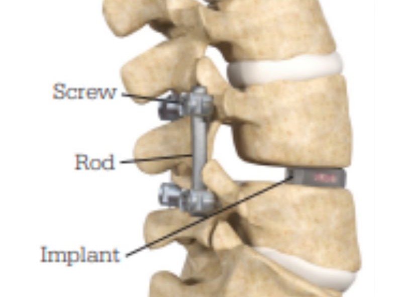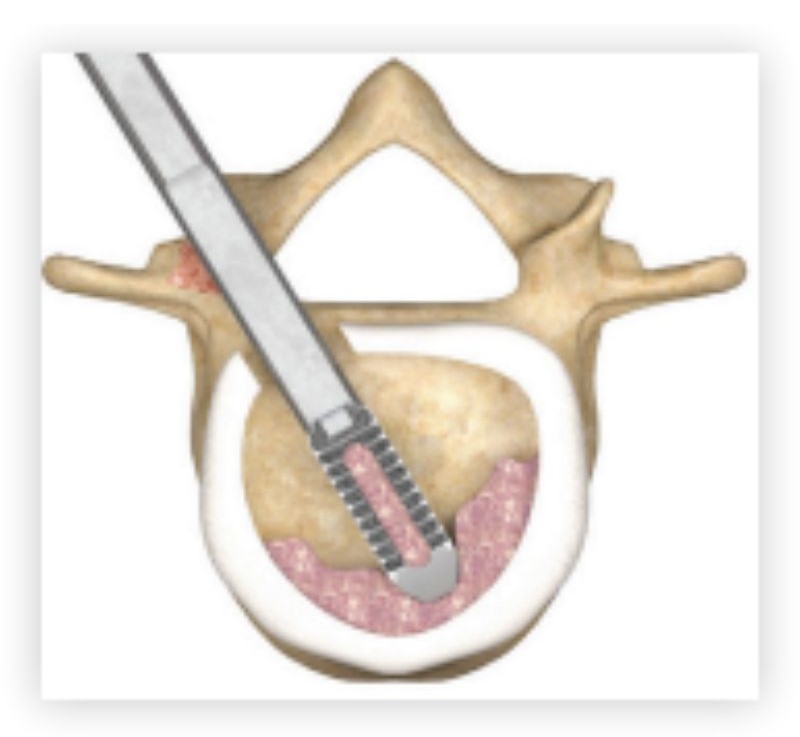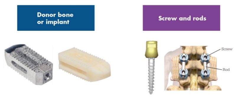 Through the opening in the retractor, your surgeon is now able to remove a portion of the back of the vertebra in order to allow access to the disc. A grasping instrument is used to remove most of the intervertebral disc. Removing the facet joints and disc is intended to help relieve pressure on the spinal nerves. A single implant, which can be either a piece of donor bone or an implant made of metal or plastic and filled with natural bone material, is placed in the disc space through the exposed area where the facet joint was removed. The implant is intended to help provide stability to the spine as fusion (growing together) occurs between the vertebrae above and below it. If successful, spinal fusion takes place in the weeks and months following surgery.